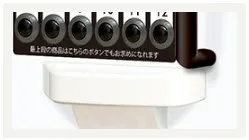 最上段にある商品選択ボタンに連動したボタンを低い位置にも設けています。小さなお子様や車椅子をご利用のお客様でも、無理なく上段にある商品をお選びいただけます。 |