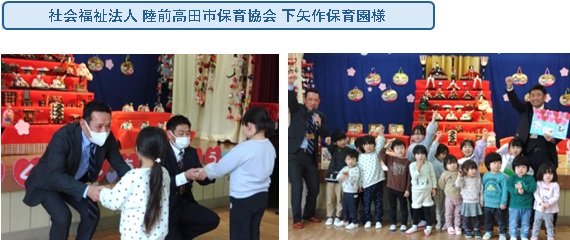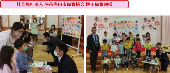 2026.03.03 岩手県陸前高田市内の保育施設へ絵本を寄贈いたしました 0 2026.2.27 陸前高田市役所4階へ設置している自動販売機の売上の一部を活用し、陸前高田市にある横田保育園様と下矢作保育園様へ絵本 計22冊を寄贈させていただきました 贈呈式では両保育園の代表園児へ絵本を手渡し、子供たちに大変喜んでもらうことができました 今後も陸前高田市や住田町と連携し、保育施設への絵本の寄付を行っていきます