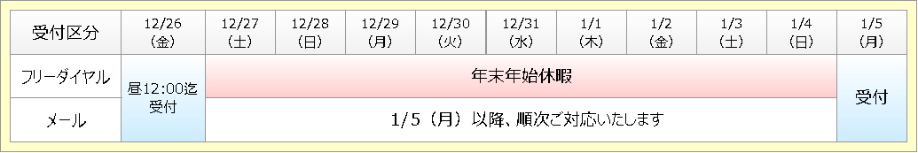 令和7年12⽉27⽇(⼟)より令和8年1⽉4⽇(⽇)の期間、年末年始休暇を頂戴いたします。つきましては、フリーダイヤル、メールの受付を下表の通りご対応いたします。