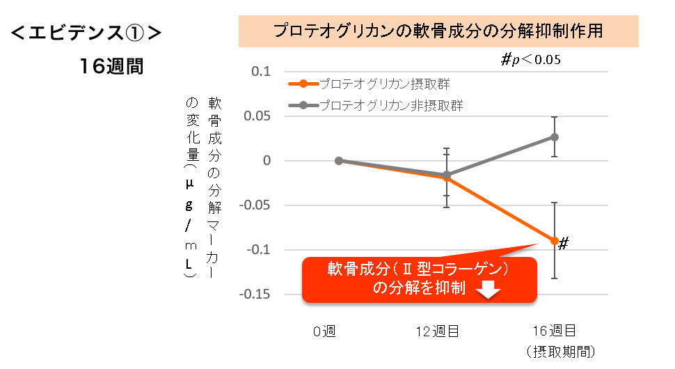 【被験者】膝関節の不快感を持つ健常な男女41名(36~71歳) 【摂取期間】16週間 【試験方法】無作為化二重盲検並行群間比較試験 【結果】プロテオグリカンを10mg含む食品または対照食品を16週間摂取し、軟骨成分の代謝の指標であるⅡ型コラーゲン分解マーカー(C1,2C)を測定したところ、プロテオグリカンの摂取群で軟骨分解を抑制する効果が示された。 出典:Tomonaga A et al., Experimental and Therapeutic Medicine,14(1) 115-126, 2017から改変 ●研究レビューによる評価です。